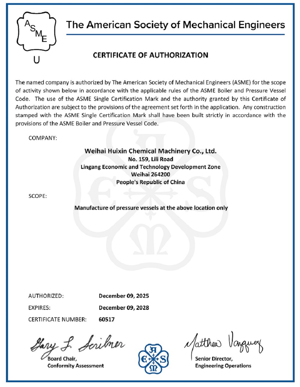 2019/Sep/05 Weihai Huixin Chemical Machinery Co., Ltd (Manshan Plant)